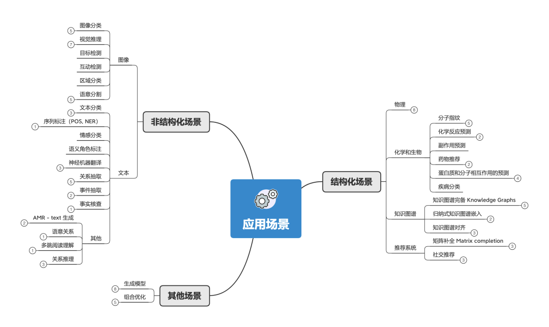 结构化场景 :数据是天然的图,数据之间有明确的关系结构,比如说物理系统、分子结构、知识图谱等。