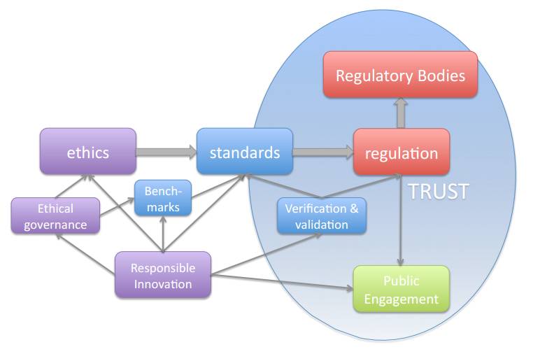 “伦理”与“标准”和“规章”相连。标准将伦理原则正式化为一种可用于评估合规水平,更有用的话,也许符合伦理标准的结构,为设计者提供如何对给定的机器人的伦理风险评估进行指导,并减轻其识别到的风险。因此,伦理加强了标准。但标准有时也需要该系统被认证符合标准或标准的一部分。因此,伦理(或伦理原则)与标准和法规相关联。尽管许多现行法律适用于机器人和自主系统,但毫无疑问,无人机、无人驾驶汽车和辅助机器人技术等迅速出现的高破坏性技术,一定需要新的法律法规和监管机构。