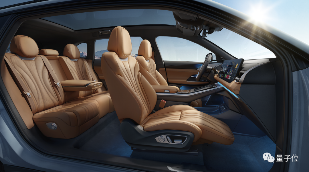 车内,环抱式座舱、95%大面积软包、中控副驾双 14.96 英寸2K联体屏、前排座椅通风按摩加热、全真皮内饰、四门无框电吸门、全景天幕、双 14.96 英寸窄边联屏、双温区智能空调等等都没缺席。