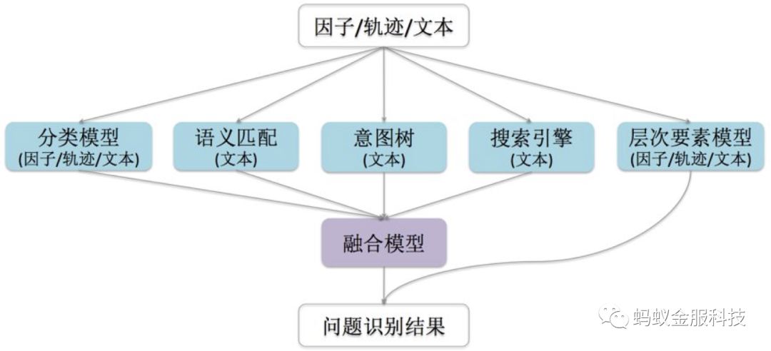 千瞳:问题识别模型是由多个子模型+融合模型的形式组织的。分类模型只是其中一种子模型,除此之外,还有搜索、意图树等多个结构化子模型。不同模型的输出格式也各不相同,分类模型返回不同类别的可能性打分,而意图树可能只返回某一个最可能的类别。在子模型各自进行问题识别后,我们会通过一个GBDT的模型,对前四个模型的结果进行融合。在融合模型阶段,我们取每一个模型的 top1输出,根据标注数据来选择输出可能性最高的那个模型的结果。