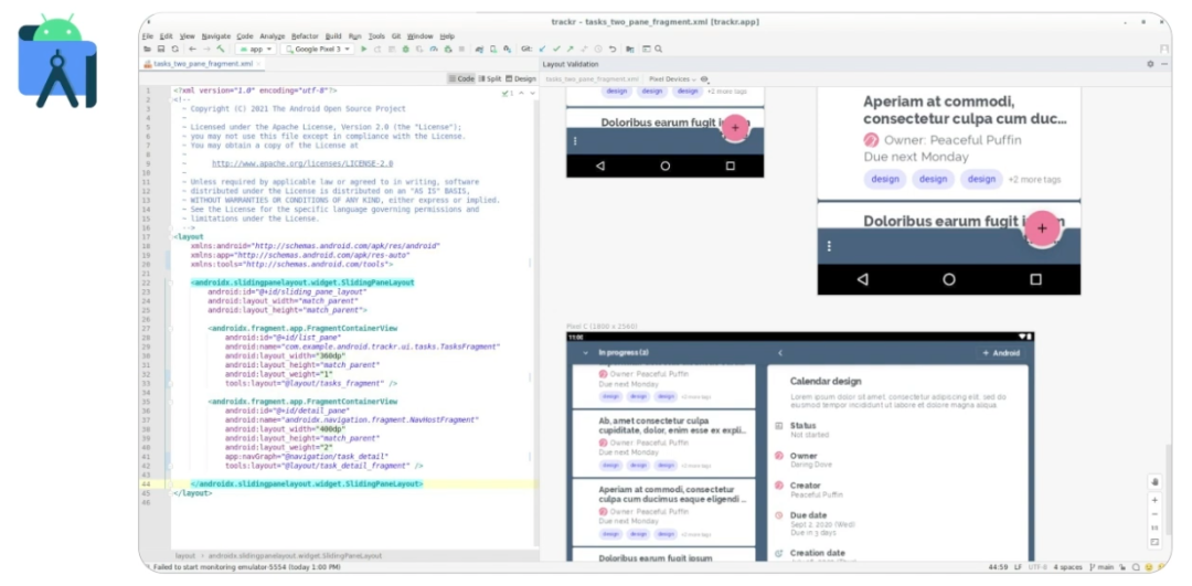 …><FragmentCOntainerViewandroid : id=”@+id/list_pane”android : layout_width=”300dp”android : layout_weight=”1”/><FragmentCOntainerViewandroid : id=”@+id/detail_pane”android : layout_width=”360dp”android : layout_weight=”2”<SlidingPaneLayout …>