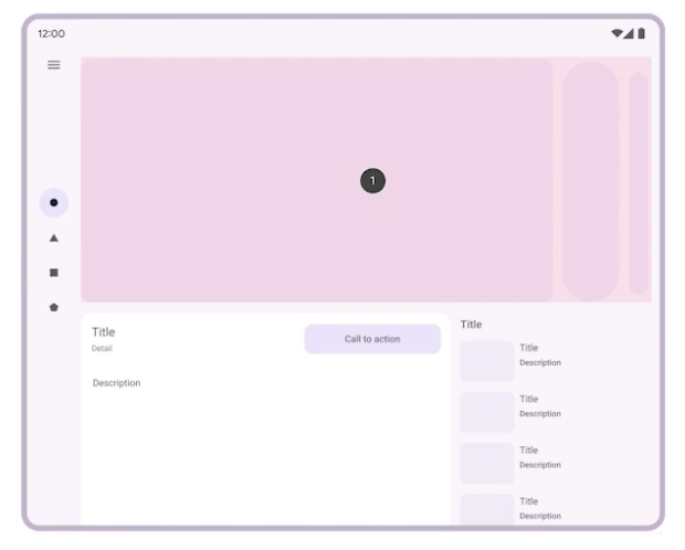 与其他大屏幕设备一样,我们需要多想想用户会怎样握持未折叠设备?如平板电脑,部分屏幕区域难以用大拇指触及,用户也很难腾出整只手来自由操控屏幕。用户轻易就能触及屏幕的底部角落,但可能无法触及屏幕最顶端,尤其是在竖屏模式下。这意味着如果您使用 Navigation rail 这类组件,将导航按钮居中或固定在屏幕底部,这会更便于用户的操作。
