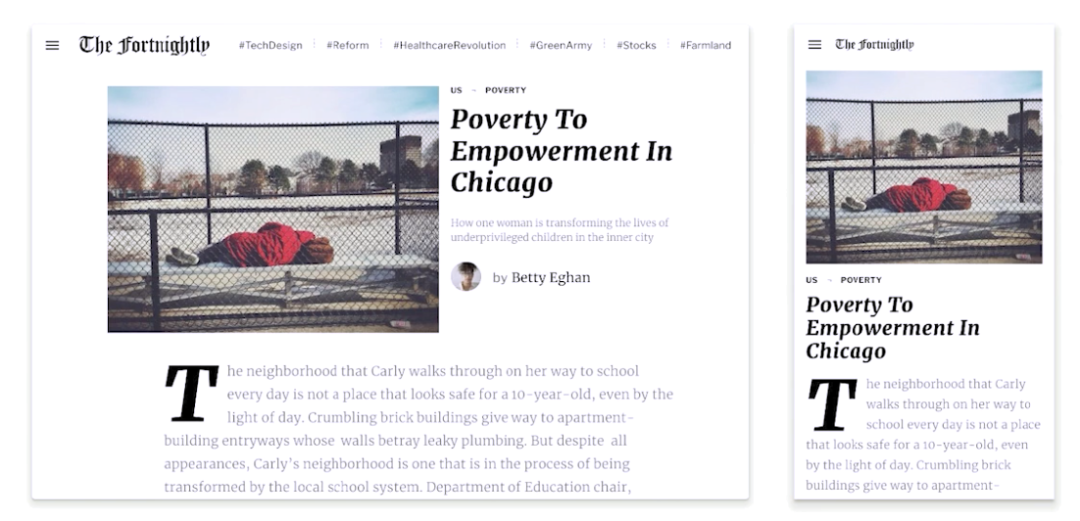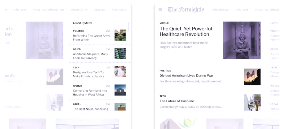 以 Fortnightly 示例应用为例,它在平板电脑上的界面布局十分均衡,这得益于它遵从了指南里对容器的建议。而且可以看到,Fortnightly 使用了视觉分隔线 (Visual Divider) 用于分隔最新新闻,在屏幕的另一边,则利用留白和排版对不同类别的新闻报道进行分组。