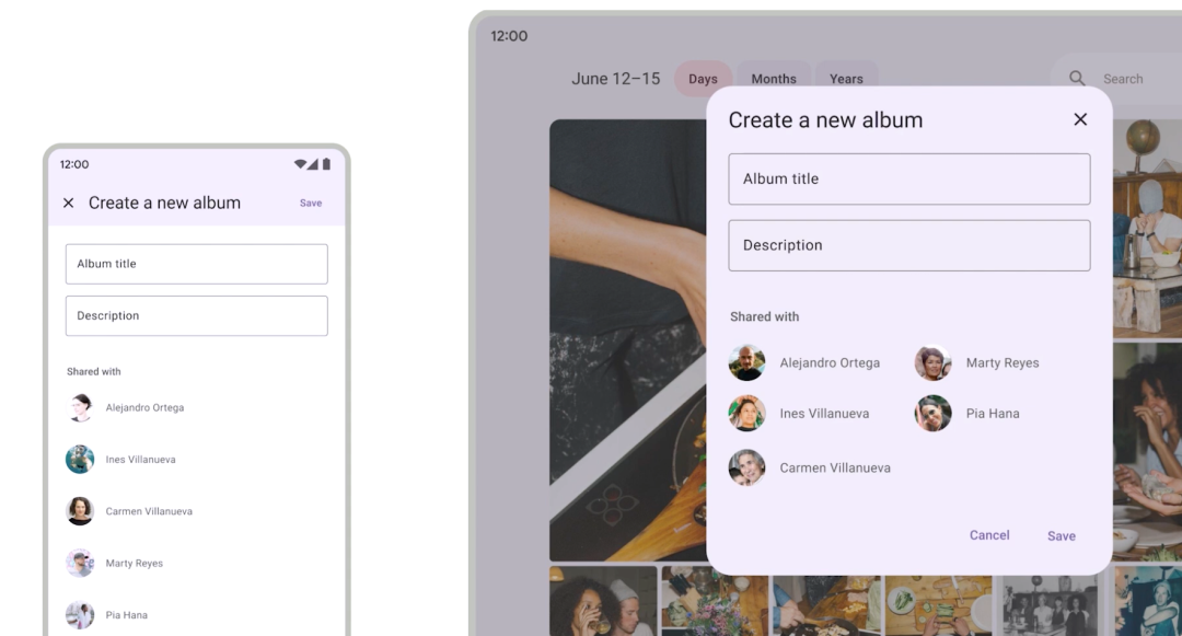 △ 在大屏上使用简单对话框 (右) 代替全屏对话框 (左)