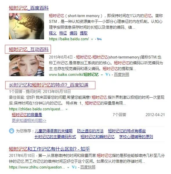 如图,面对海量的搜索结果,用户很可能忘了哪些点过哪些没点过,而链接点击前后的颜色变化(如红框所示,链接点击后变成紫色)能帮助用户快速区分。历史搜索功能也是同理。