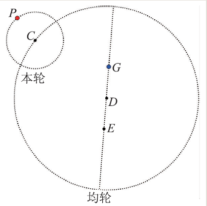 图2 托勒密模型示意图:P 为天体;C为本轮圆心;G为地球;D为均轮圆心;E 为匀速对称点,G、E 关于D对称。天体P 相对于本轮圆心C 做匀速圆周运动,本轮圆心C 在均轮上做圆周运动且相对于匀速对称点E 保持速率不变