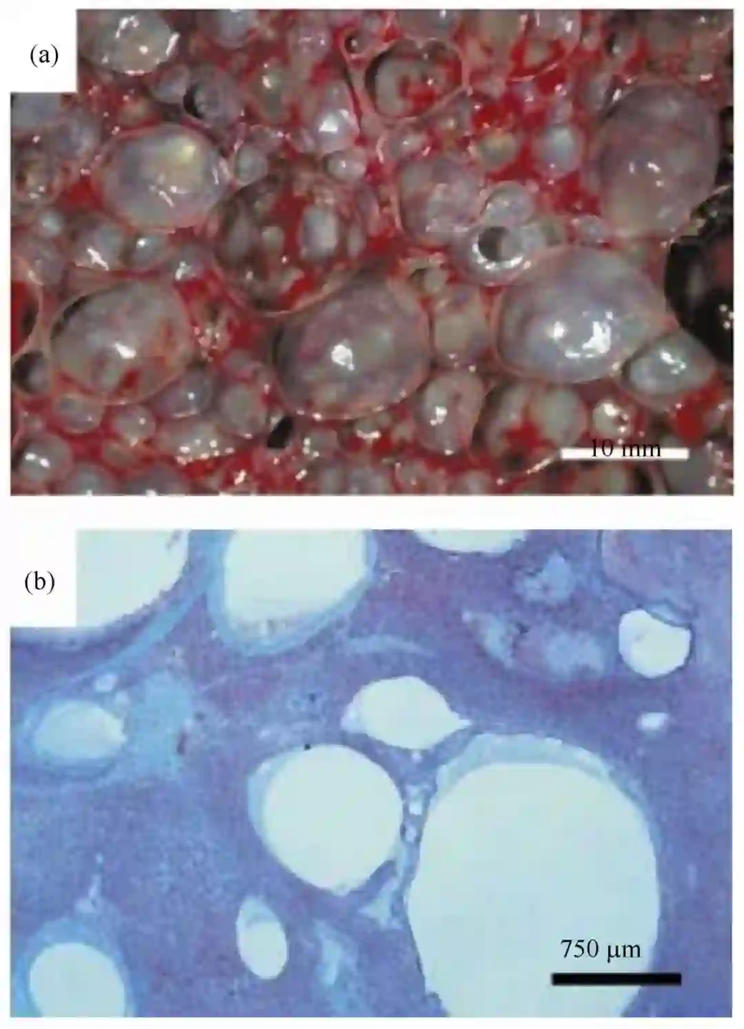 (b)显微镜图,图中空泡的直径为50~750 mm