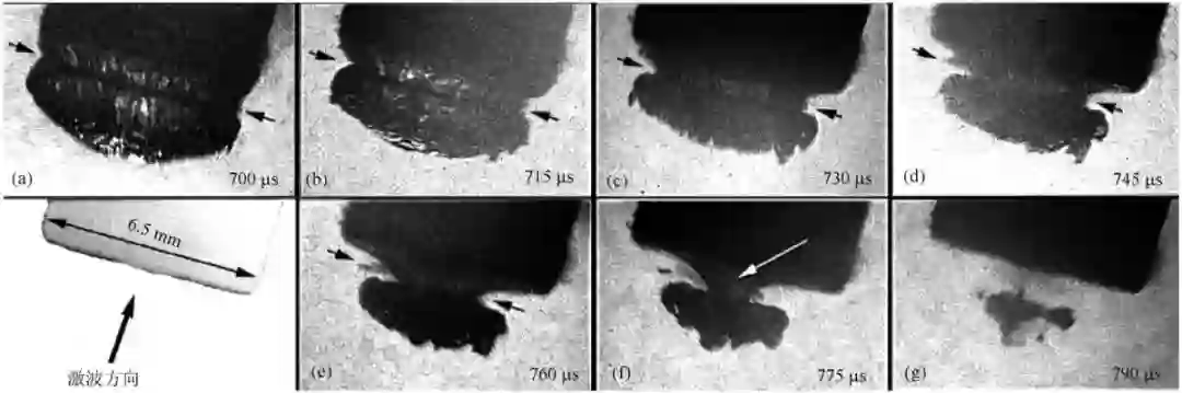 图6高速摄影拍摄到的体外激波碎石过程中结石表面的空化云溃灭过程