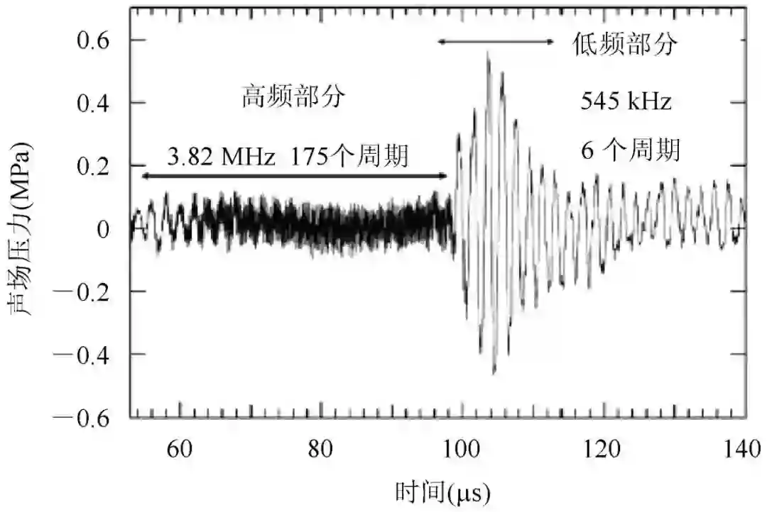 尽管体外激波碎石法被广泛应用,该方法却有一定的副作用(如可能引起出血、高血压、血栓和肾损伤等),可能引起病人治疗期间的不适,并且对胆结石和比较大的结石无明显疗效。鉴于该方法的上述缺点,一些新兴的替代技术(比如肾盂镜激光碎石术等)已经得到一定程度的应用。其他正在研发中的碎石技术包括体外无创聚焦超声波碎石法(波形见图7)。该技术主要采用聚焦的超声波在结石表面产生空化云,利用空化云破裂过程中产生的强大的破坏力将结石逐渐粉碎成细小的粉末。该方法首先采用高频的超声波(如图7 中的3.82 MHz 的超声波)促使空化云在结石表面的形成和激发空化云的振荡,随后再利用低频的超声波(如图7 中的545 kHz 的超声波)诱发空化云的溃灭,超声波的能量会在空化云内部不断的传递和聚集,最后在空化云内部某处强烈的释放,对结石形成强有力的破坏,“咬”下一小块结石。整个上述过程大概持续80~90ms,经过一小段间歇后,上述过程不断的重复,最终整个结石将被彻底粉碎为非常细小的粉末,可以很方便的从人体内排出。很多患者经过体外激波碎石法治疗后,其被粉碎后的结石依然很大,其等效直径可能大于2 mm,无法顺利从人体内排出,而体外无创聚焦超声波碎石法的相关实验显示,治疗后,结石被空化效应完全粉碎为细小的粉末(图8),可以很方便的通过尿道等从人体内排出。另外,由于聚焦超声技术的发展,超声波的聚焦精度远远高于激波,可以对结石进行“精确打击”,避免伤及无辜(如周围的组织等),这样可以大大削弱治疗过程中产生的并发症。体外无创聚焦超声波碎石法仍在发展中,是一项很有前途的结石治疗技术,期待不久的将来能用到临床治疗中。