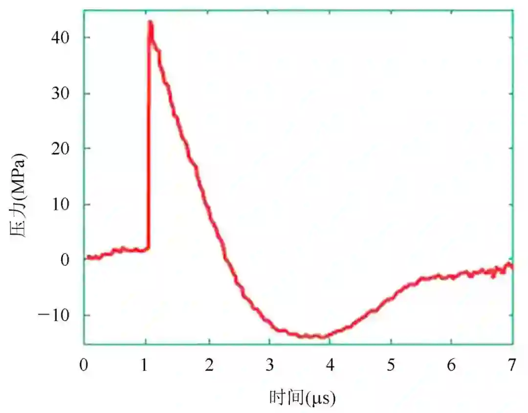 体外激波碎石法1980 年由德国的公司发明,并于1983 年实现商业化,随后成为治疗结石的一项常规技术。治疗过程中,在激波发生器和人体接触的部位进行一定的特殊处理,保证产生的聚焦的激波(波形见图4)可以比较容易的穿过人体的脂肪和组织等部位,最终作用在人体中的结石部位并将其击碎。激波粉碎结石的机理包含很多物理效应,包括应力的破坏,空化效应和疲劳等。