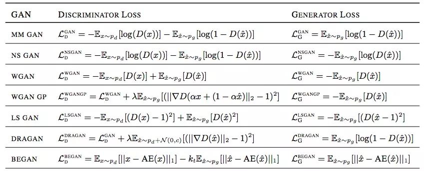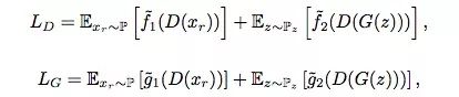 虽然近几年许多研究人员提出了很多新的损失函数,但它们相比SGAN没有太多根本上的进展,因此大多数GAN可以用non-saturating和saturating函数简单地分成两类:g1=− f1 and g2=− f2,saturating;g1=f1 and g2=f2,non-saturating。从本质上来说,它们有一定的相通之处,为了后面方便对比,本文假设所有GAN都用non-saturating损失函数。