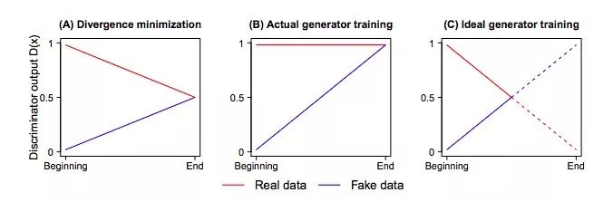 如果生成器的学习率设得很高/迭代次数很多,再加上判别器输出了个约等于1的概率,这时生成器“眼里”的实际数据和伪数据是不平等的,它会认为伪数据更真实,C(xf ) > C(xr)。而如果是坚信有一半伪数据的判别器,它会被迫把实际图像分类成伪数据,背离正确分类的目标。