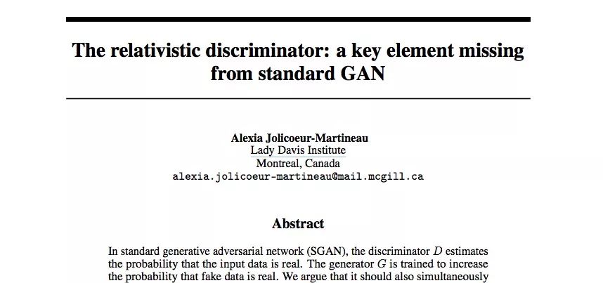 编者按:近日,加拿大犹太综合医院Lady Davis Institute的生物统计学家Alexia Jolicoeur-Martineau发表了一篇令人瞩目的论文,引起“GAN之父”Ian Goodfellow的注意。在论文中,她指出现有的标准GAN(SGAN)还缺少一个基本属性,即训练生成器时,我们不仅应该提高伪数据是真实数据的概率,还应该降低实际数据是真实数据的概率。这个属性是一个重要基础,它也是所有GAN都应该遵守的。