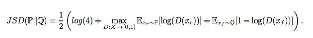 对于xr∈P和xf∈Q,如果D(xr) = D(xf ) = 0.5,JSD最小化;如果D(xr) = 1,D(xf) = 0,JSD最大化。