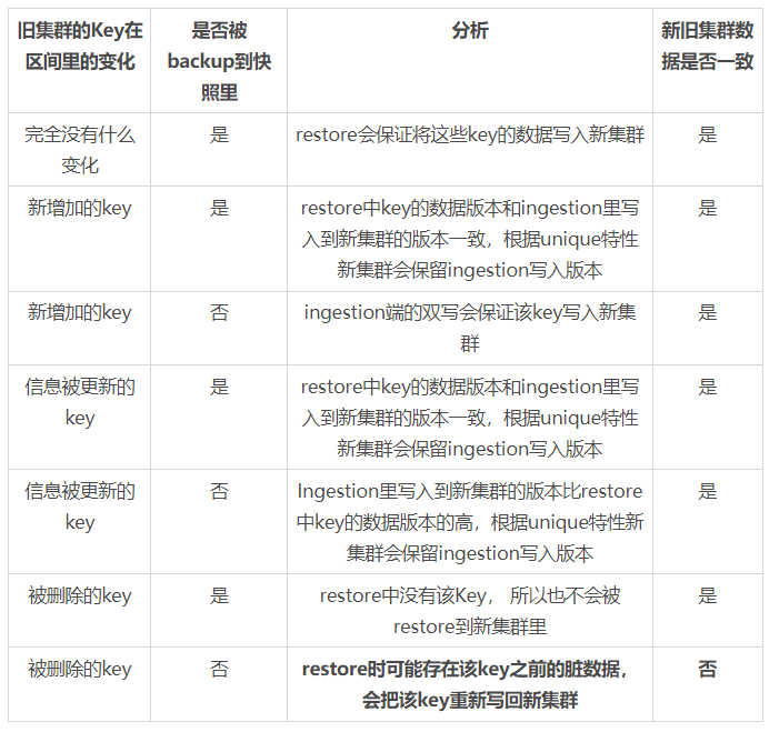 通过对以上各种场景的分析可见,delete key 部分相对特殊,可能会存在 Ingestion 端去在新集群中执行删除后的 key 再次被 restore 阶段写回(执行删除操作的时刻早于 restore 的操作),因此会带来新旧集群的差异。而其他场景的最新数据状态已经如实反映在新集群里,无须记录和对齐。