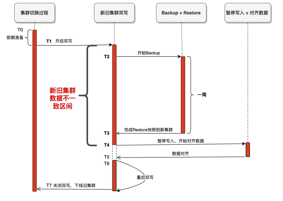 首先我们看一下新旧集群数据不一致的区间发生在哪里,下面是一个集群切换的大致时序图: