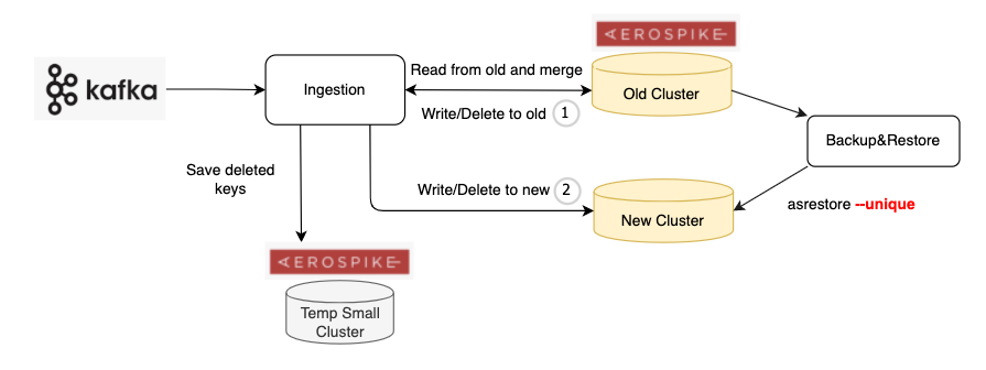 这时可以充分利用 Aerospike 在 restore 过程中 unqiue 特性:“如果 key 在 Aerospike 里已经存在那么 restore 就不再向集群中写入该条数据”, 来保证 restore 的数据不会覆盖 Ingestion 端的最新数据版本。