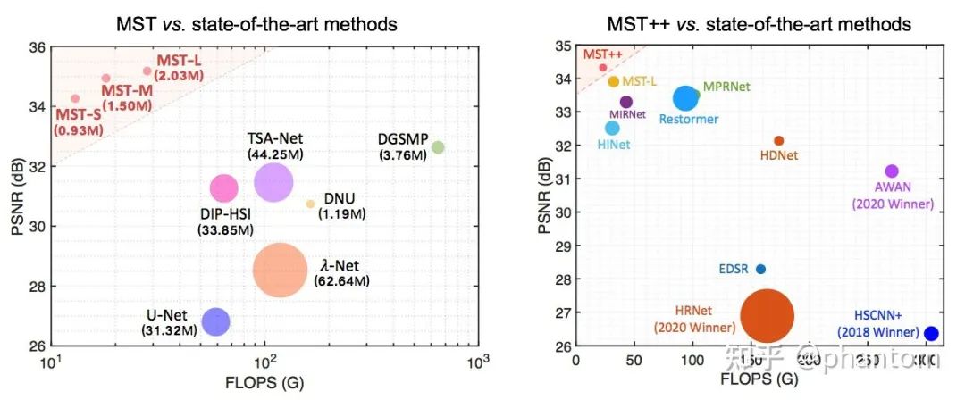 先验货,MST 与 MST++ 与 SOTA 方法对比如图1所示,很轴为计算量,纵轴为性能,圆半径代表参数量。MST 与 MST++ 占据了左上角,参数量也非常小,实现多快好省的高光谱图像重建。