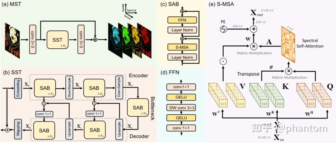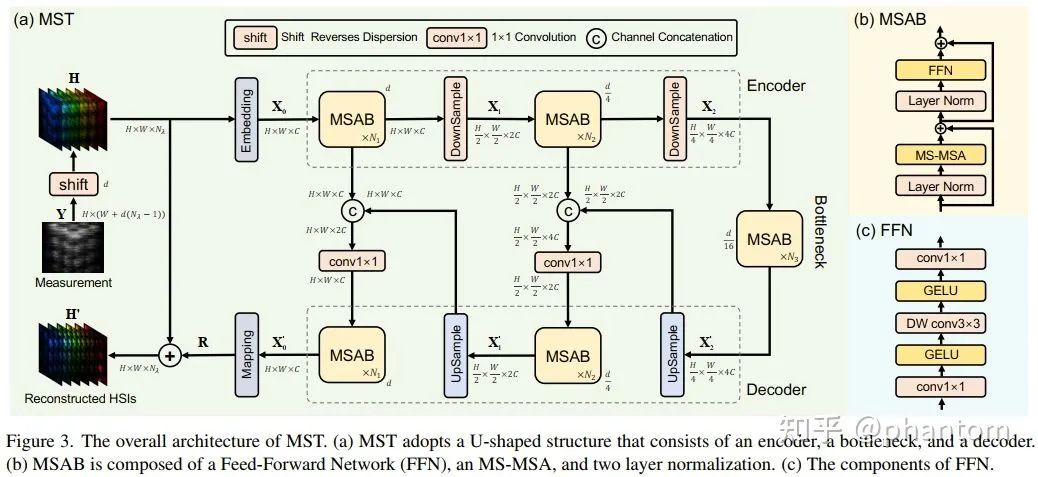 针对从 2D measurement 到 3D HSI cube 的光谱图像复原,我们提出了 Mask-guided Spectral-wise Transformer (MST),如图3 (a) 所示。MST是一个对称的 U 形的网络,其基本组成单元为 Mask-guided Self-Attention Block (MSAB), 如图3 (b) 所示。MSAB 中最重要的就是 Mask-guided Spectral-wise Multi-head Self-Attention (MS-MSA)。MSAB 包含两个 Layer Normalization (LN),一个 MS-MSA 和一个前向神经网络 Feed Forward Network (FFN),如图3 (c) 所示。
