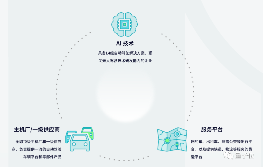 AI公司提供自动驾驶技术,主机厂发挥车辆生产和制造所长,出行和货运平台则完成自动驾驶的终端应用。