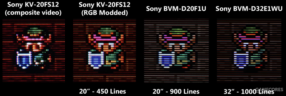 挑机器时不光要看外观成色,显像管的状态同样重要。首先要判断显像管的几何(下图第四个测试图像线条是否平直)和汇聚(清晰与否)是否正常。同城有条件的建议自己带上设备,搭配好 240P 测试套件(一个可以检查显像管状态的软件,可以运行在各种游戏设备上。不过不建议用树莓派做测试设备,因为它本身的输出可调节,会产生干扰)当面测试。网上购买的话也建议让卖家拍下测试图片做为判断的依据。其次要观察 CRT 设备亮度是否正常,是否存在衰减老化。这两点只要有一点不满意建议马上放弃,不要贪便宜,省得日后徒增烦恼。