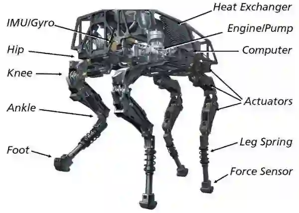 Big Dog 高度约为 1 米,重量约为 109 公斤,可以背负 45 公斤的有效负载进行自由行走或奔跑,最快移动速度可达 6.4 公里 / 小时,最大爬坡角度可达 35 度。同时,Big Dog 能够适应多种复杂路况,即便在雪地或泥洼中也能行走自如,就算有人在其侧面施加外力,Big Dog 也能快速调整四足动作,以保持身体稳定,避免摔倒。它之所以具备如此强大的能力,离不开其精巧的设计结构和缜密的计算系统: