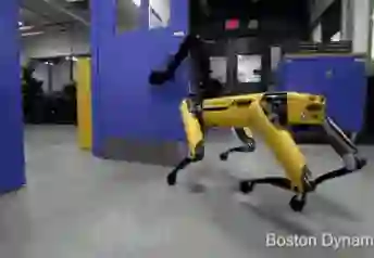 在波士顿动力公司发布的宣传视频中,Spot Mini 在人类阻拦的条件下,仍用自身搭载的机械臂奋力打开了关闭着的铁门。