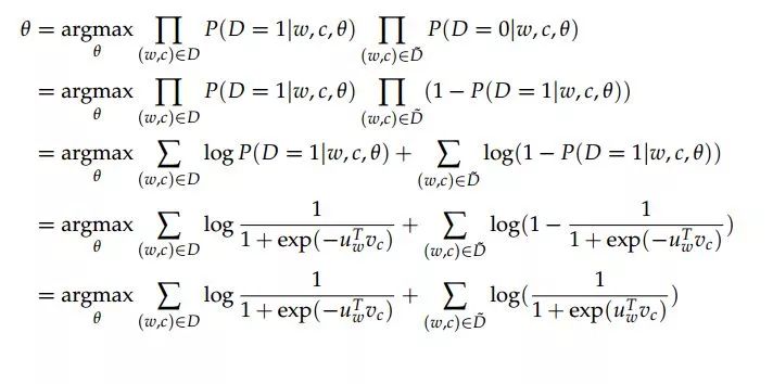 我们使用sigmoid函数对P(D=1|w,c)建模,即, 是模型未知参数的同时,也是我们前文提到的V和U。定义,