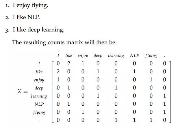 将语料集看成整体,在一个指定大小的上下文语境窗口内,记录每个单词出现的次数。显然,X的维数是V*V,V表示词汇量。举例说明,假设语料集内有3句话: