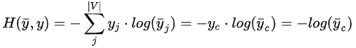 通常,概率领域的建模会使用信息理论来测量2个分布之间的距离。在CBOW模型中,我们选择交叉熵作为损失函数,即  ,y是one-hot向量,中心词
