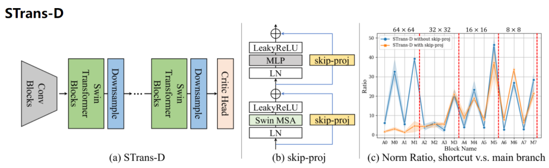 Transformer 在每个自注意力层的子层和点全连接层(pointwise fully connected layer)上使用残差连接。通过对范数比的详细分析,可以发现在基于Transformer 的判别器中,残差连接往往主导信息流。在判别器中执行自注意力和全连接操作的子层在训练过程中被无意中绕过,从而导致图像合成质量低下和收敛缓慢。研究人员通过将每个残差连接替换为跳跃投影层来解决这个问题,这样可以更好地保持残差块中的信息流。