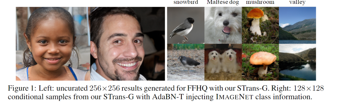对于条件图像生成,在提出的Adain-T层中,Strans-G将CIFAR10上的SOTA起始分数从10.14提高到11.62。由于CIFAR10是一个被广泛采用的数据基准,这一结果也表明了STrans-G在有限数据下模拟真实分布的稳健性。