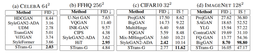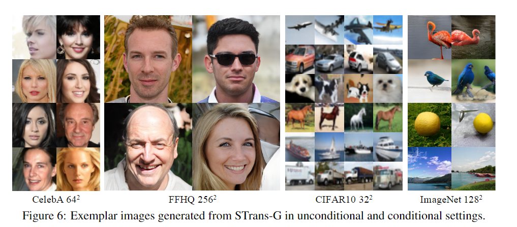 在无条件的生成中,Strans-G在Celeba 64x64中显著地超出了之前的所有方法。它在FFHQ 256x256的高分辨率设置方面也取得了相当的性能。