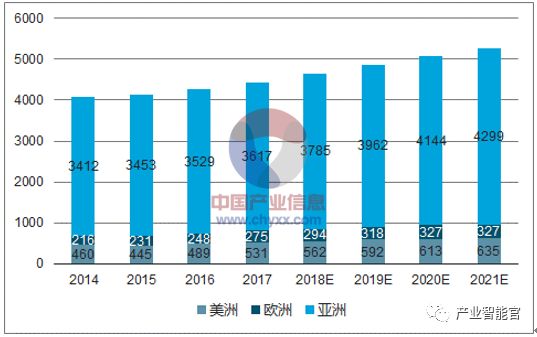 2015 年和 2016 年全球电子设备智能制造行业收入分别约为 4,129 亿美元和 4,266 亿美元,预计到 2021 年可达到约 5,260 亿美元, 2017-2021 年年均复合增长率约为 4.4%。其中,亚洲市场在 2015 年和 2016 年收入约为 3,453 亿美元和 3,529 亿美元,在全球电子设备智能制造行业总收入占比约为 84%和 83%。预计到 2021 年,亚洲市场收入将达到约 4,299 亿美元, 2017-2021 年年均复合增长率约为4.4%。