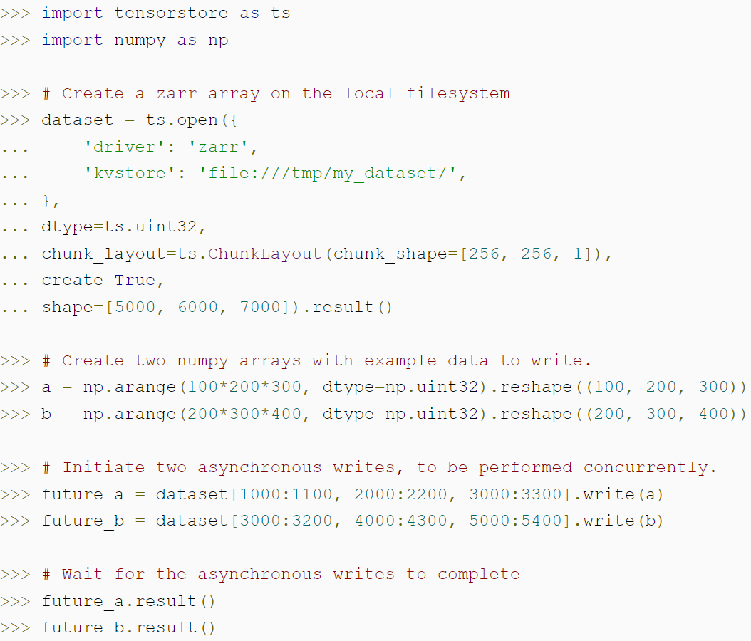 下面的代码演示了如何使用 TensorStore 创建一个 zarr 数组,以及 TensorStore 的异步 API 如何实现更高的吞吐量: