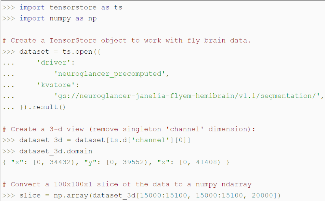 TensorStore 提供了一个简单的 Python API 用于加载和操作大型数组数据。例如,下面的代码创建了一个 TensorStore 对象,该对象代表一个 56 万亿体素的苍蝇大脑 3D 图像,并允许访问 NumPy 数组中 100x100 的图像 patch 数据: