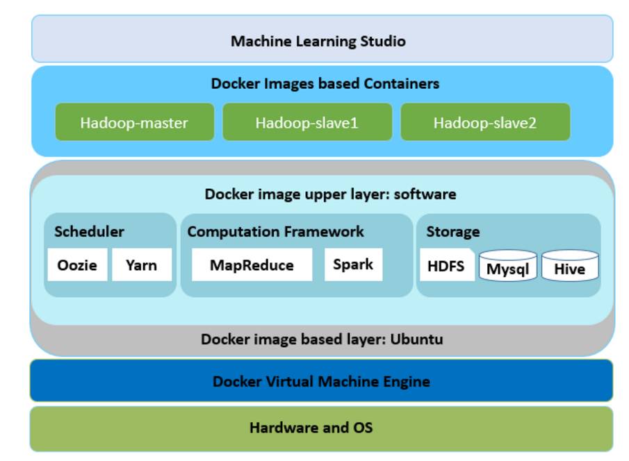 执行任务的云服务。我们基于开源的 Hadoop 和 Spark 大数据平台建立了该服务。为了建立一个平台,我们在 Docker 上组织了服务器集群。从 GUI 上接受一个 DAG 任务之后,在所有的独立数据源准备好时,每个节点将会自动安排运行。对应节点的算法将会依据实现在 Linux、Spark 或者 Map-Reduce\cite 上自动安排运行。