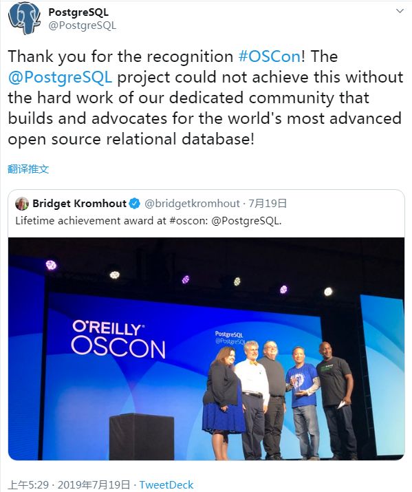 PostgreSQL 在推特表达了感谢,感谢 OSCON 对其的认可,以及社区为 PostgreSQL 所做的贡献。