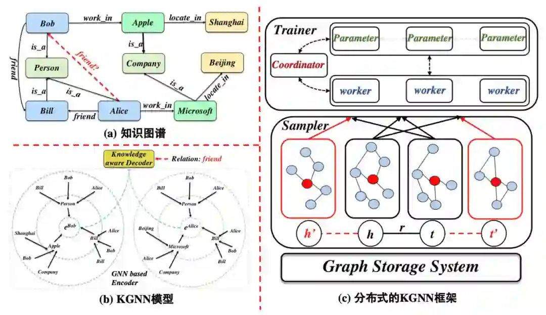 现在我们探索KGNN的分布式实现,它为大规模知识图表示提供了一个完整的解决方案。如图1(c)所示,分布式KGNN由三部分组成: