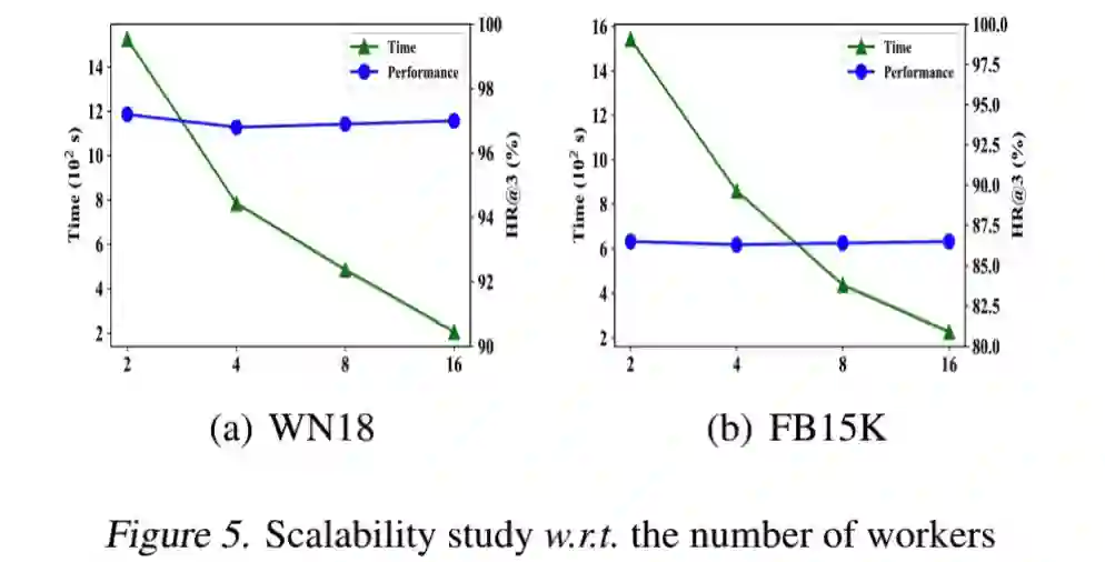 如图所示,在WN18K和FB15K这两个数据集上。我们将worker数从2增加到16,可以明显地加速KGNN的训练。与此同时,随着worker数量的增加,预测性能几乎没有损失。