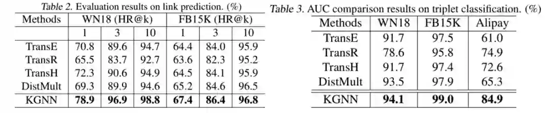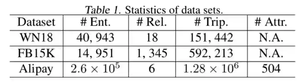 我们在WN18,FB15K和Alipay三个数据集上进行了实验,具体在链路预测和三元组分类两个任务上验证了有效性。实验数据集如下所示。