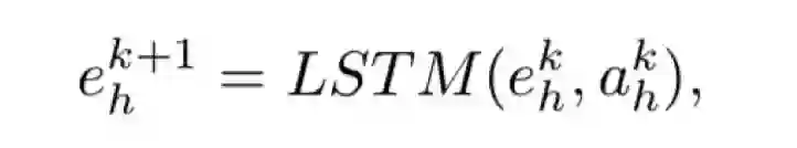 受跳跃知识(JumpingKnowledge)网络思想的启发,我们采用自适应深度函数灵活地多跳邻居,以更好地实现结构感知表示。这里应用LSTM实现f(U)进行表示更新。因此,我们可以得到实体h的k + 1表示为: