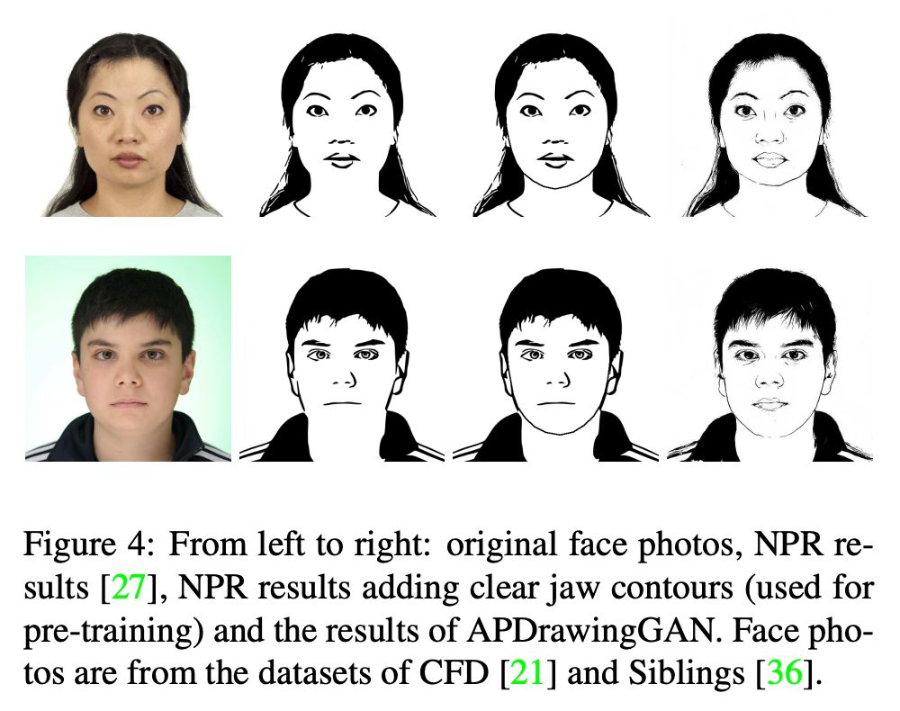由于由艺术家手绘的肖像图的成本过高,实验组是收集了 140 对面部照片和相应的肖像画的数据集(由专业人员手绘的肖像图),为了实现少量图像对下的训练,从 10 个面部数据集中收集了 6,655 张正面照片,对每张图片使用双色调 NPR 算法 [1] 生成肖像图纸,这个阶段得到的结果通常会产生没有明确下颚线的结果(由于这些位置的图像中的对比度低),再使用 OpenFace [2] 中的面部模型来检测颌骨上的标记,然后将下颌线添加到NPR结果中。