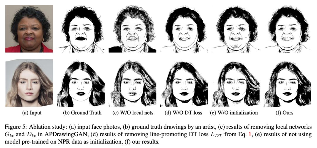 为了有效地学习不同面部区域的不同绘图风格,GAN 架构涉及专门用于面部特征区域的几个局部网络,以及用于捕获整体特征的全局网络。为了进一步应对艺术家绘画中基于线条笔划的风格和不精确定位的元素,还提出了一种新的距离变换(DT)损失来学习 APDrawings 中的笔划线。