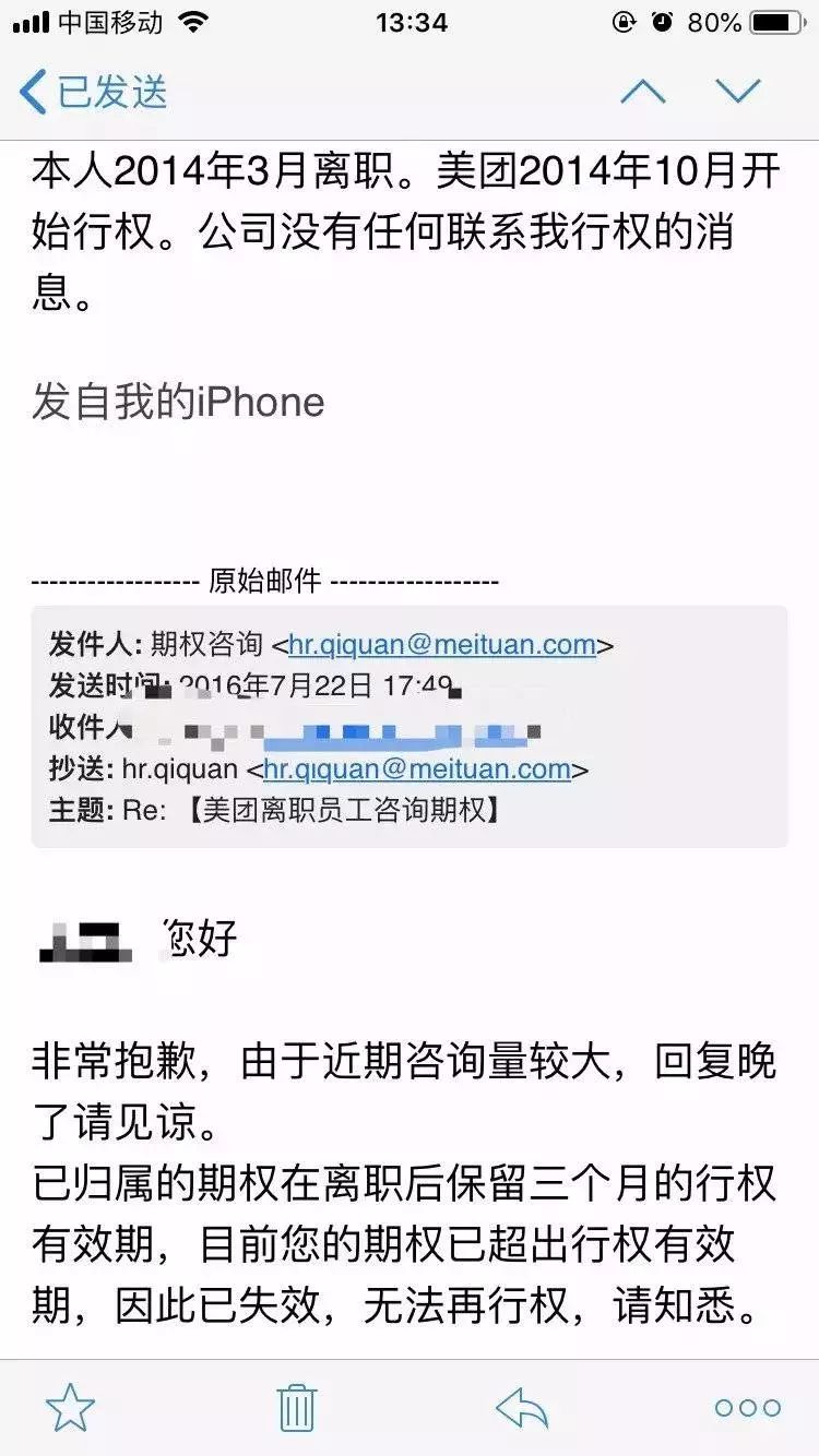 在美团工作超5年的阿苍2015年离职,办理手续时经同事提醒要求行权。彼时美团正值与大众点评合并,美团邮件解释称以内合并影响,她的“离职不牵扯多少天行权,财务理顺期权关系后可行权时会通知”。一等就是一年,一年之后再联系是,原来的对接人已经离职,新对接人表示已经行权通知,过期失效了。