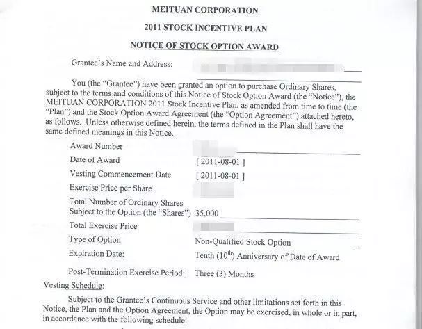 2011年8月1日,美团授予刘继汉35000股MEITUAN CORPORATION(美团注册于开曼群岛的公司,下称美团公司)期权。时间财经看到的期权文件显示,期权的授予日与起始日均为2011年8月1日,每股行权价0.4美元。根据美团点评招股书,MEITUAN CORPORATION为该集团的全资附属公司。