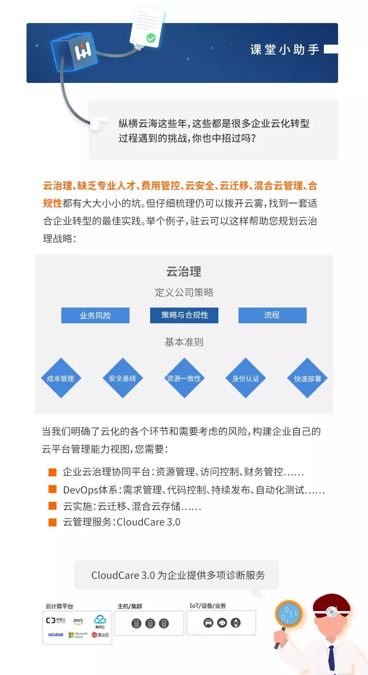 驻云主要着重关注了云治理、DevOps体系、云实施和云管理服务这几个点,提供了自己独有的解决方案。接下去我们就为大家介绍一下,我们在针对这些挑战给出的解决方案。