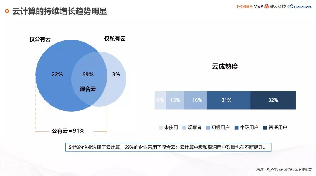 我们再来看一下整个云计算的持续发展的状况,这个数据是来源于RightScale《2019年云状态报告》,在整个调研的企业对象中,94%的企业是选用了云计算。其中91%是公有云的用户,69%是采用了混合云的模式。非常重要的一点,云计算中级和资深用户数在不断的提升,达到了63%。什么是中级用户?中级用户是指有多个应用已经在部署在公有云上了,而且有一部分是关键性应用,并且正处于一个不断拓展云的使用力度的阶段。资深用户是指一些重度云计算的使用者。他们不仅只关注业务的问题,也在逐步的探索和优化云管理和费用的方式。这些中级和资深的用户在整个云计算的比例达到了63%,而且这个数字相对于去年有一个很大的提升。