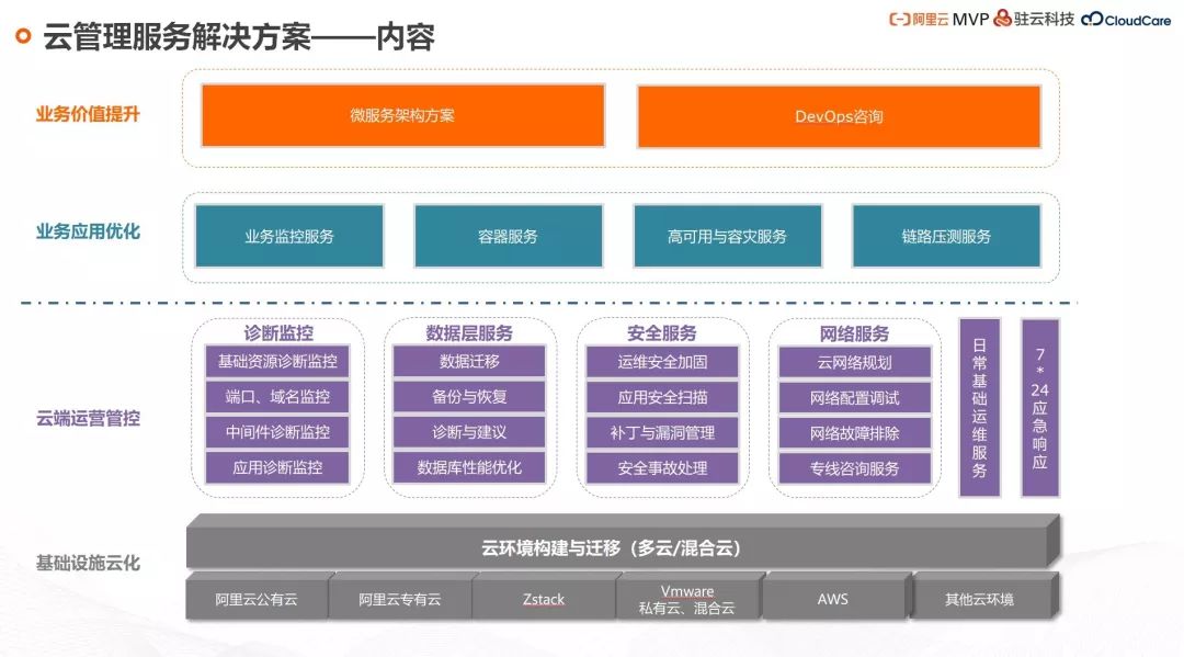 第三个,帮助企业提升自己业务价值的能力。像一些微服务架构的构建,还有一些DevOps体系构建等等,这个就组成了我们整个云管理服务解决方案的内容。