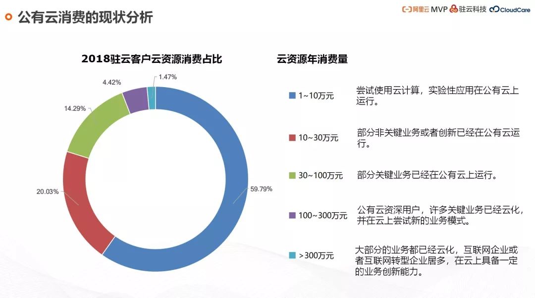 我们再来看一下国内公有云消费的现状。大家知道驻云是阿里云生态的一员,2018年,对于我们服务过的上千多家客户的云资源,我们做了一个简单的分析。